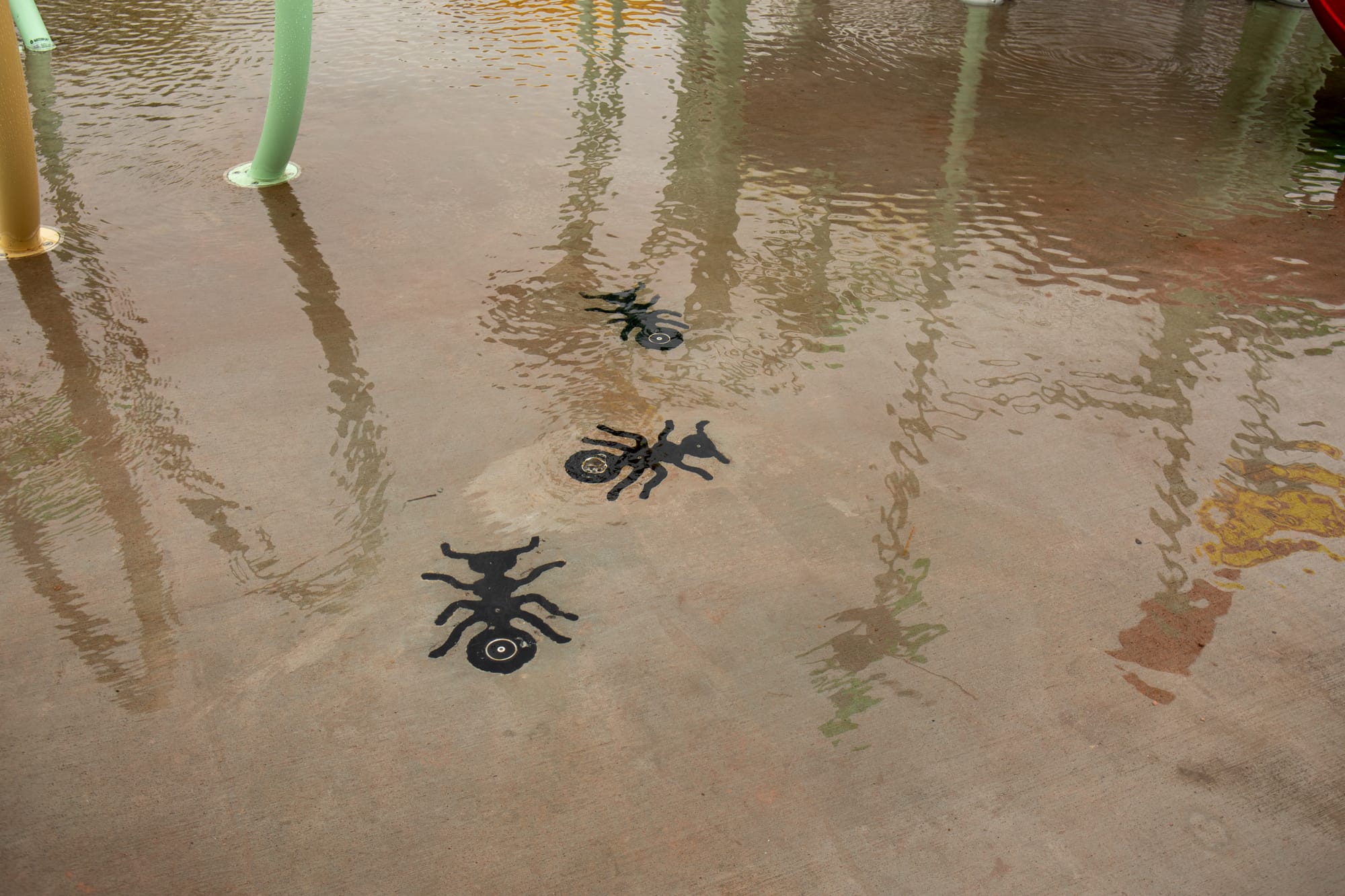 The splash pad has various play features, slides and bucket dumper. There are also several canopies where guests can find shade.