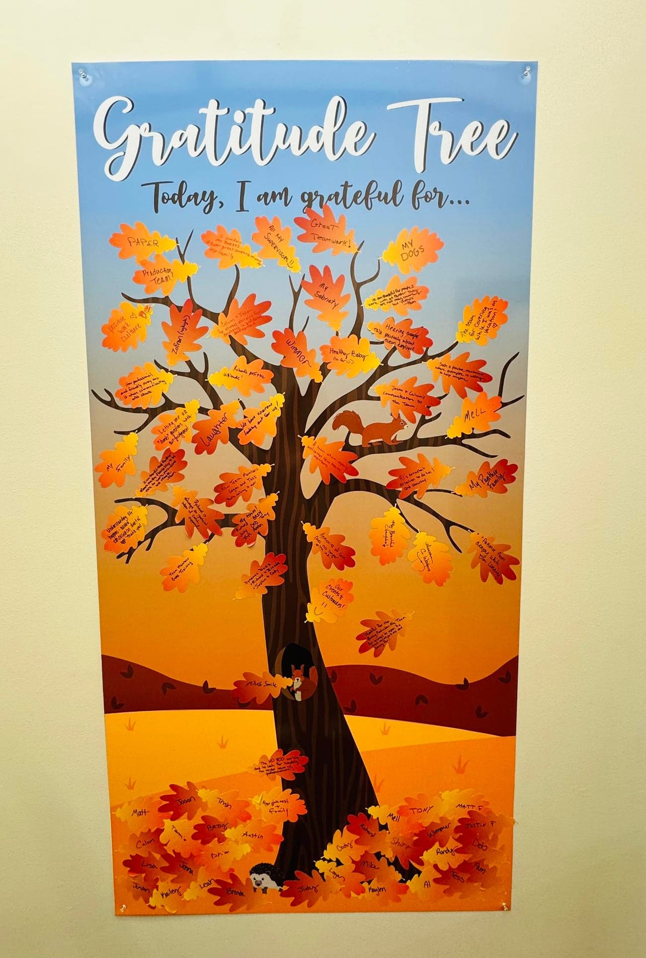 - That gratitude practice extended to the entire team this year with the help of a tree display in the office. Employees were invited to write something they're grateful for on the leaves.