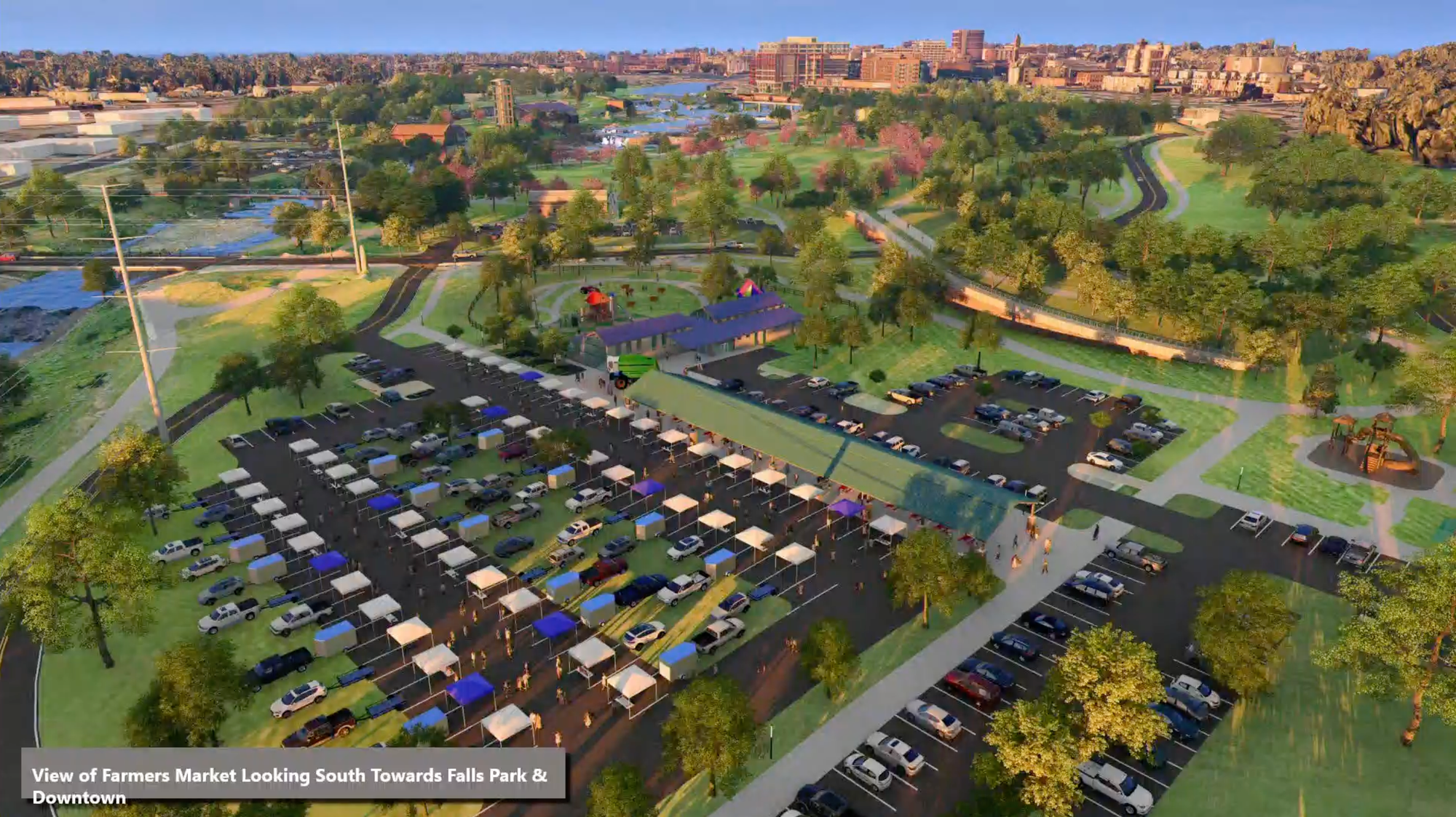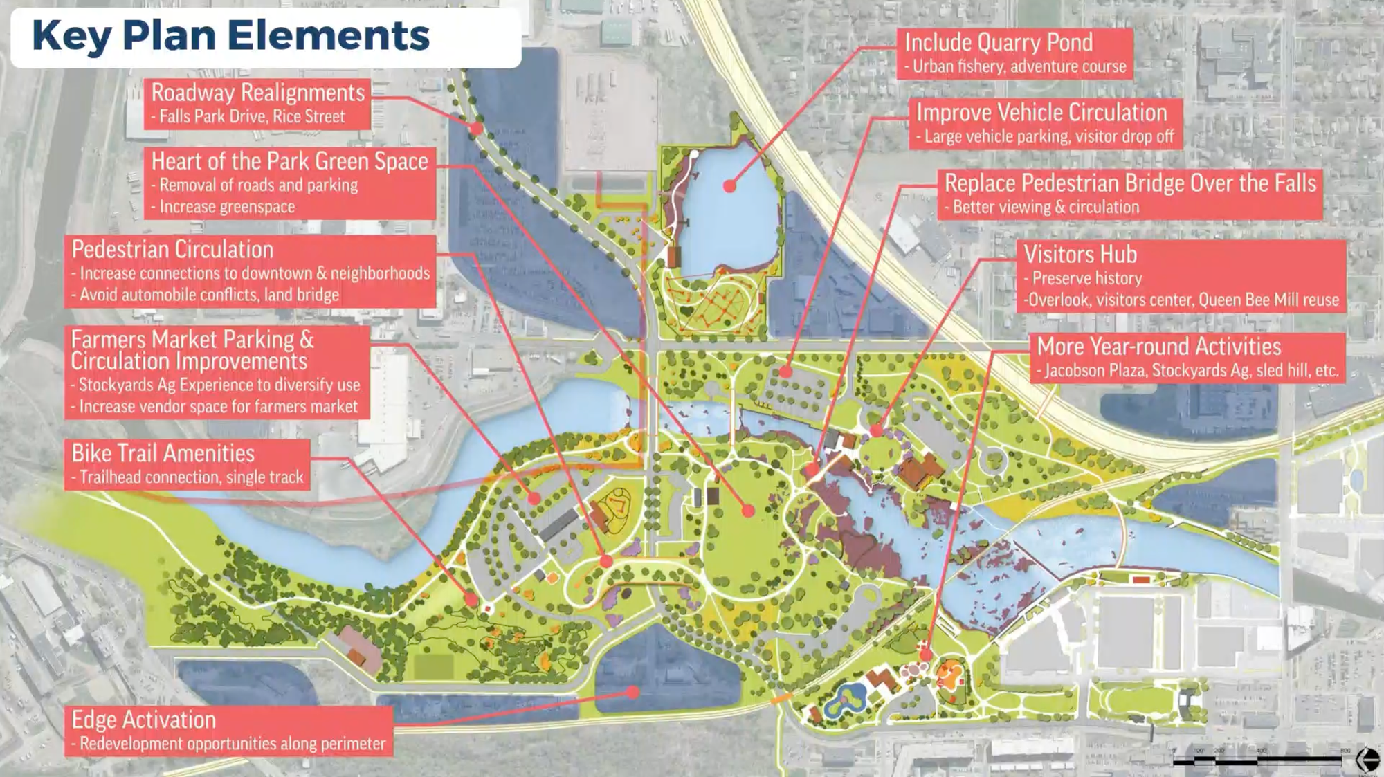 Breaking it down further, the plan would look at improving both pedestrian and vehicle traffic around the Falls and the Farmers Market while also bringing more green space to the center of the park.
