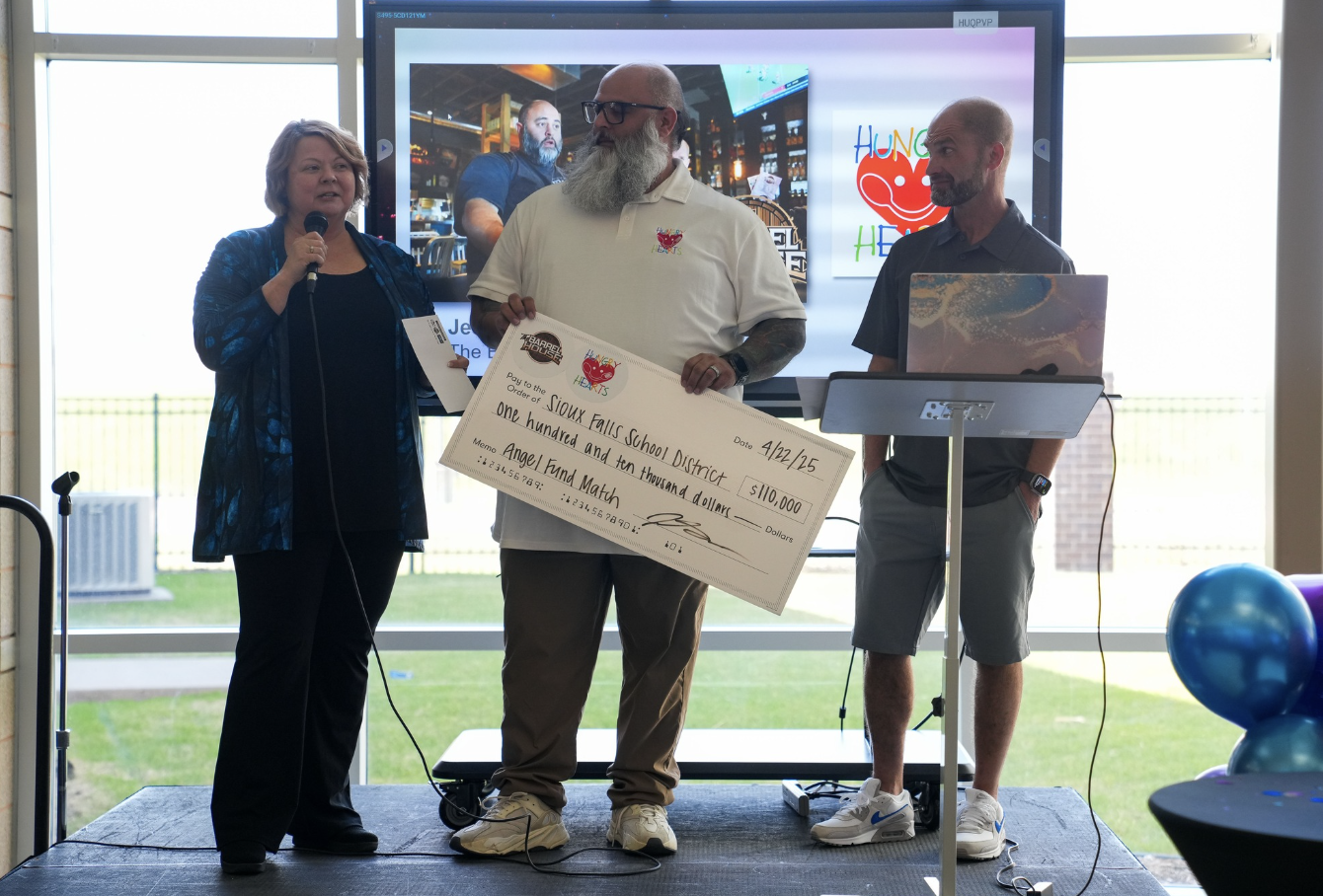 - Big money for school lunches. Hungry Hearts, a nonprofit arm of The Barrel House restaurant presented a check for $110,000 to the Sioux Falls School District Angel Fund, helping the fund reach its $200,000 goal. The nonprofit had promised match funds up to $100,000, and then when the district got to $90,000 raised, opted to go above and beyond to get the fundraising effort across the finish line. That money will help cover student lunch debt so no kids go hungry. Learn more here.