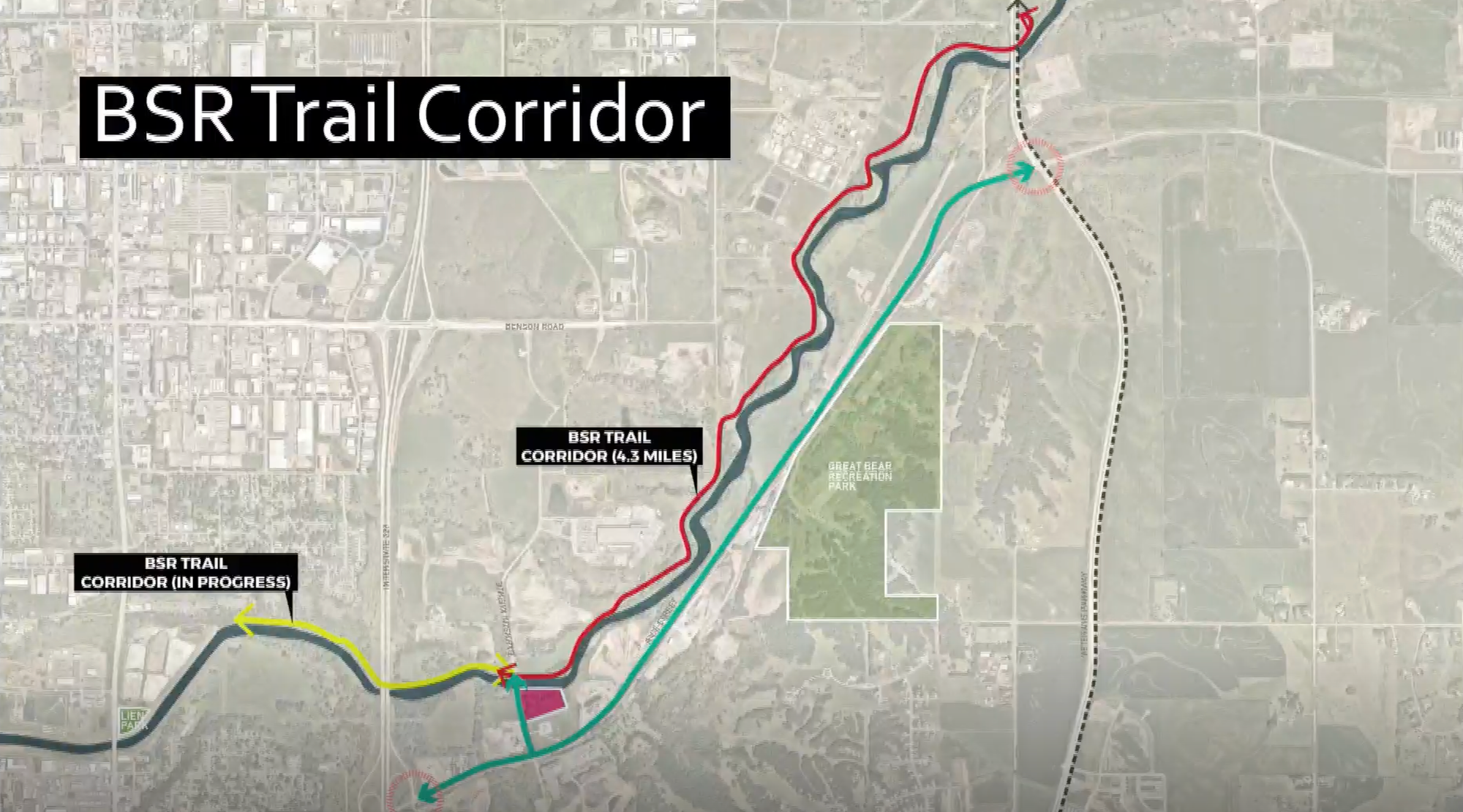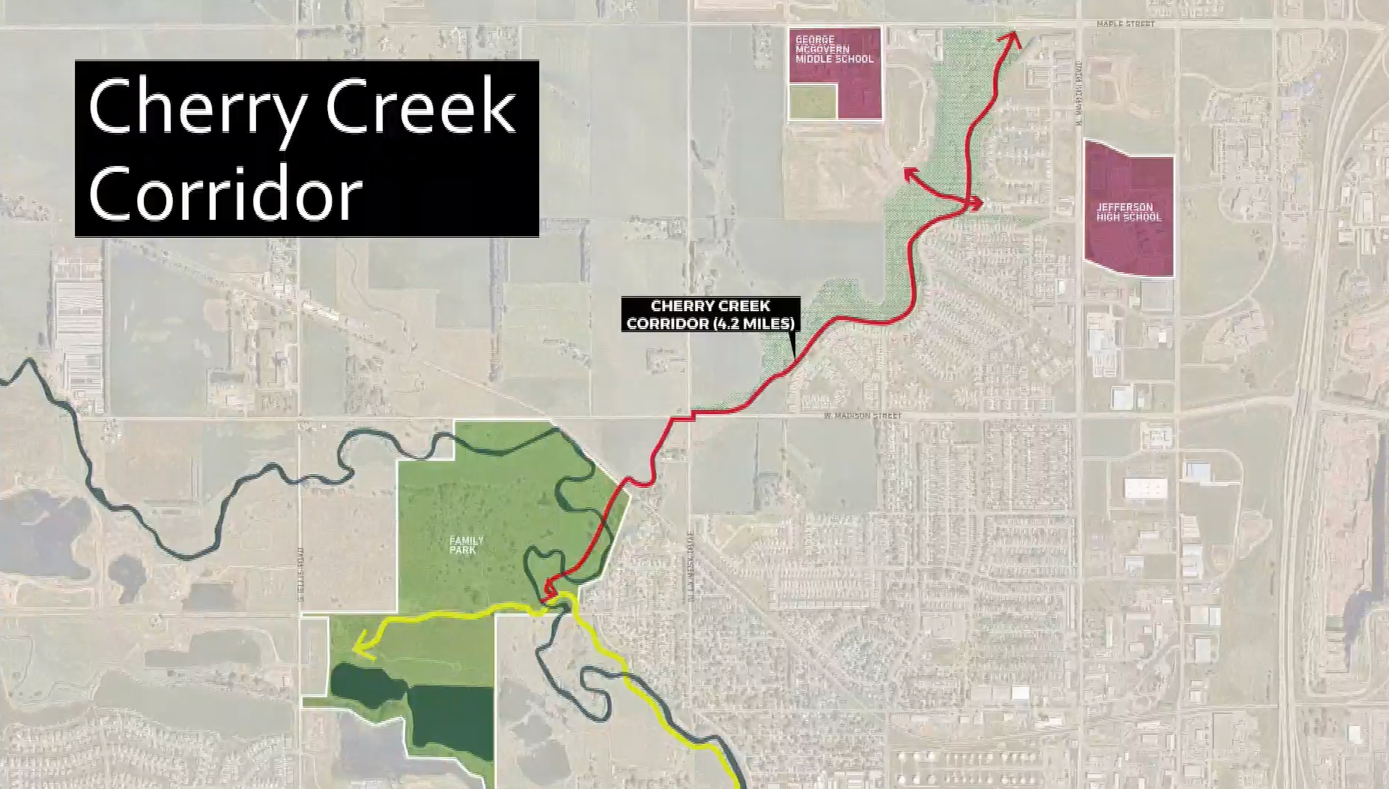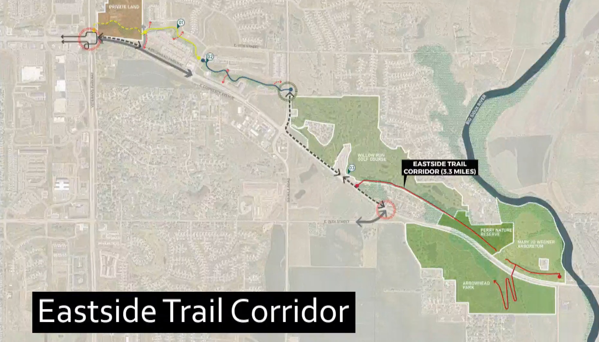 - Right now, there are three main priorities for expansion: the Cherry Creek corridor on the northwest side of town, the Big Sioux River corridor connecting Lien Park to Bahnson Avenue, and the Eastside corridor north of Arrowhead Parkway out to the Mary Jo Wegner Arboretum.