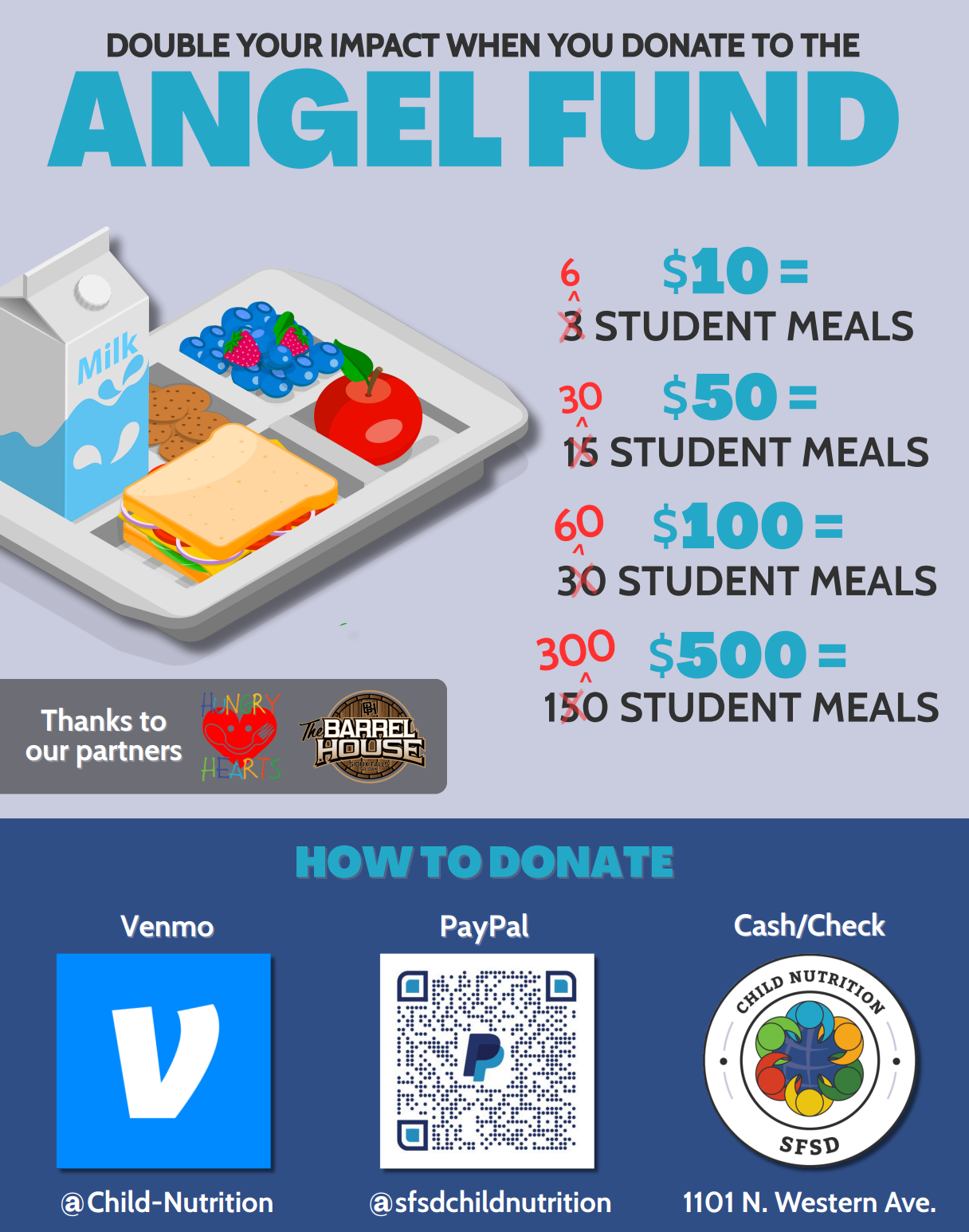 - Match gift to keep kids fed. Hungry Hearts this week pledged to match donations to the Sioux Falls School District's Angel Fund up to $100,000. The Angel Fund covers student lunch debt to ensure all kids are able to get a hot meal. Every dollar counts, and even a $10 donation provides more than a week of meals for one kid. Here's more info: