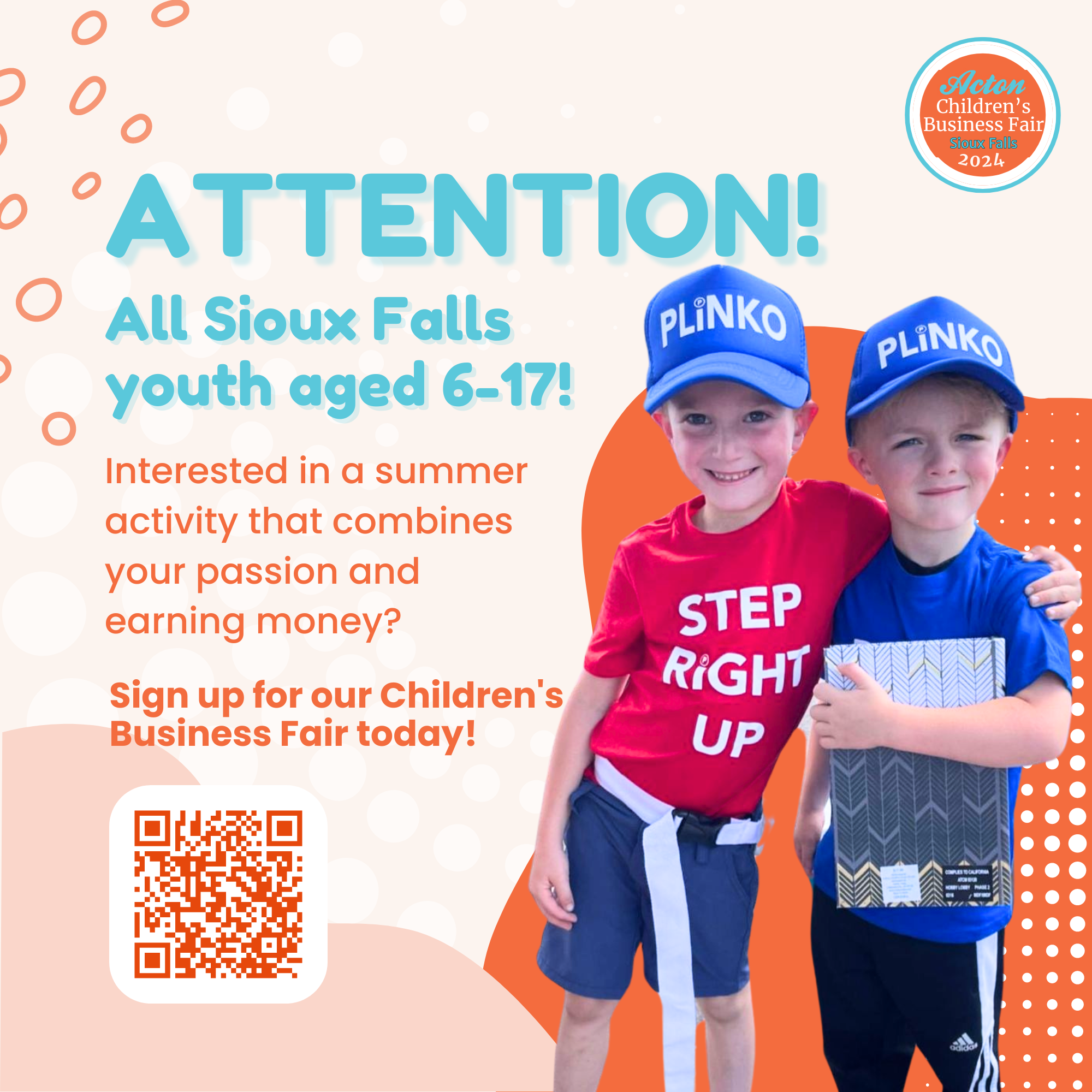 - Acton Children's Business Fair Sioux Falls gives kids a chance to launch their very own businesses and find their first customers. Kids develop a brand, create a product or service, build a marketing strategy, and then open for customers at the one-day marketplace on June 27. The deadline to apply is June 16. Learn more and sign up here.